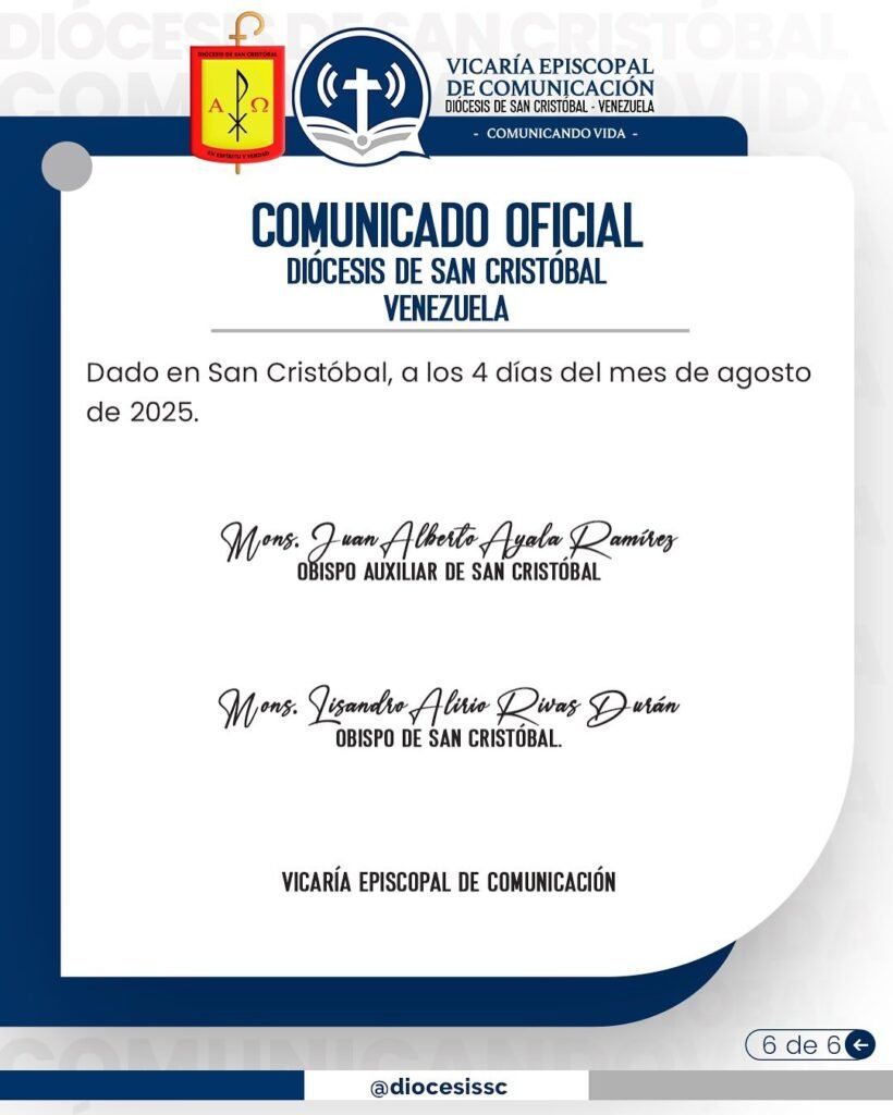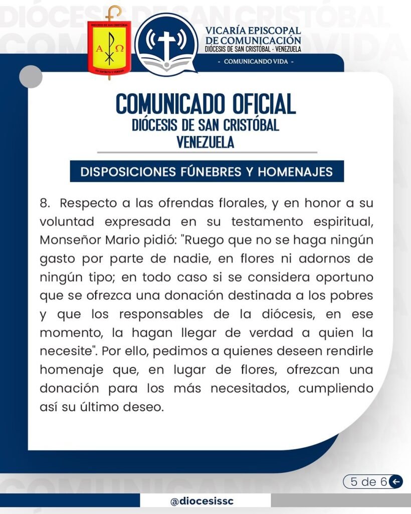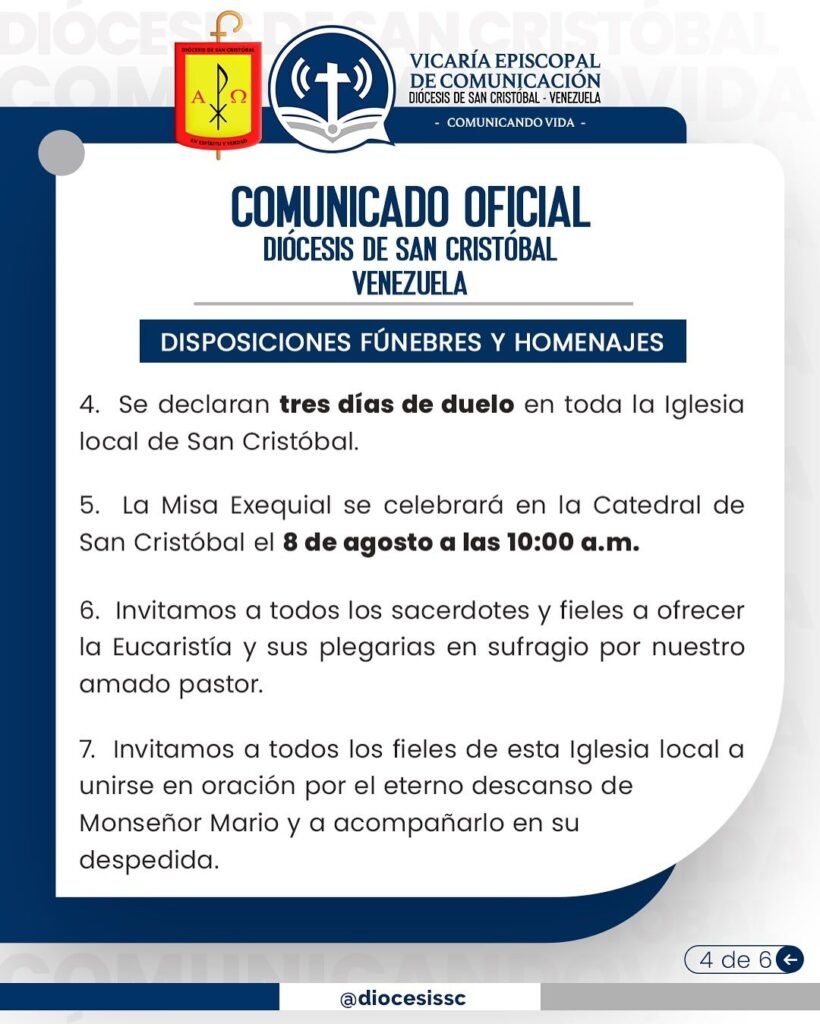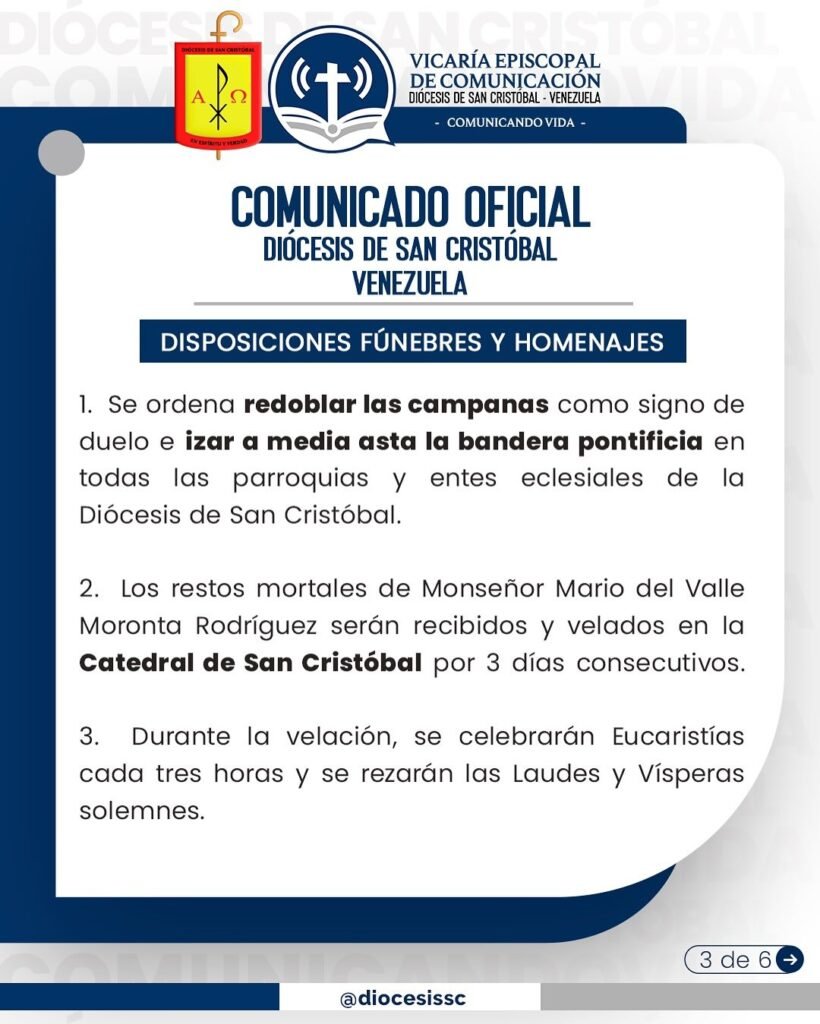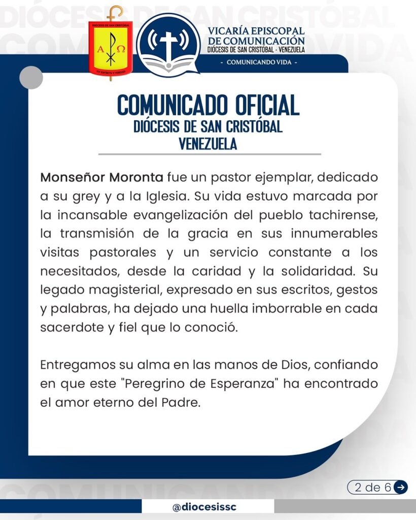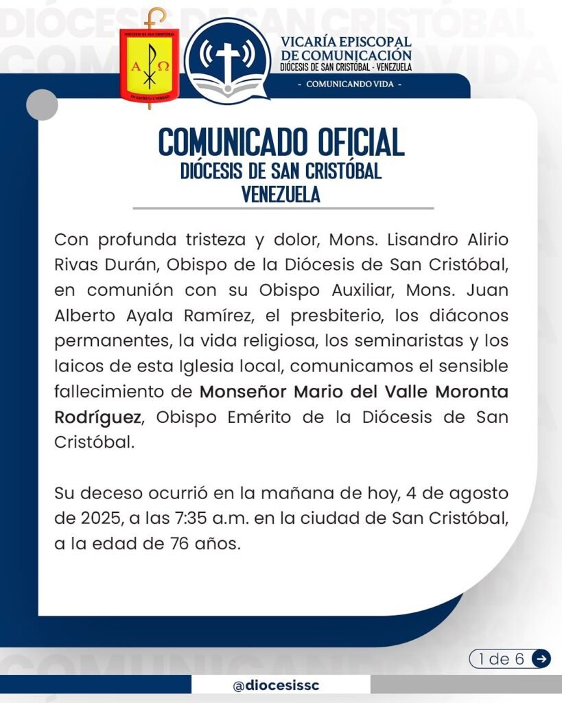 Con profunda tristeza y dolor, Mons. Lisandro Alirio Rivas Durán, Obispo de la Diócesis de San Cristóbal, en comunión con su Obispo Auxiliar, Mons. Juan Alberto Ayala Ramírez, el presbiterio, los diáconos permanentes, la vida religiosa, los seminaristas y los laicos de esta Iglesia local, comunicamos el sensible fallecimiento de Monseñor Mario del Valle Moronta Rodríguez, Obispo Emérito de la Diócesis de San Cristóbal.