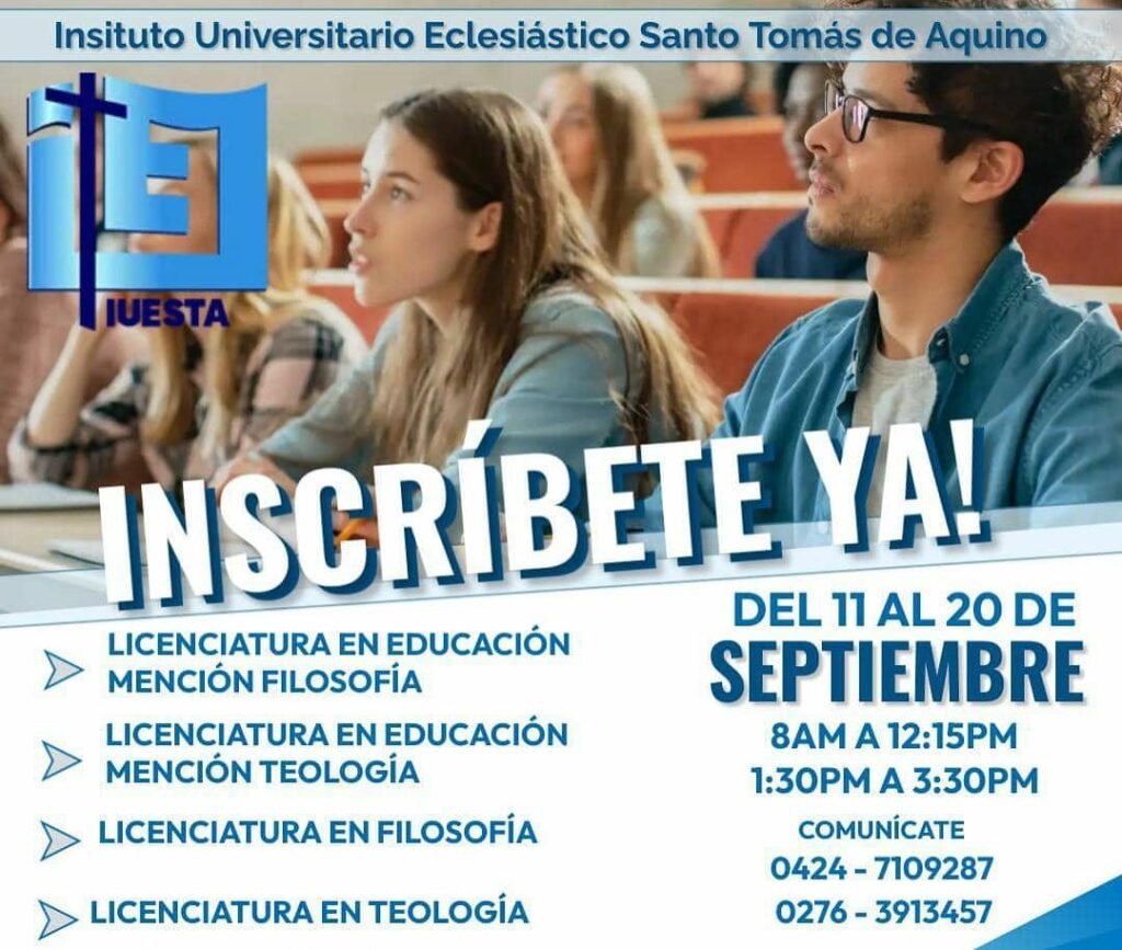 El Instituto Universitario Eclesiástico Santo Tomás de Aquino ofrece para este periodo académico 2023-2 las carreras de licenciatura en filosofía, licenciatura en educación mención filosofía, licenciatura en teología, licenciatura en educación mención teología, con modalidad presencial.