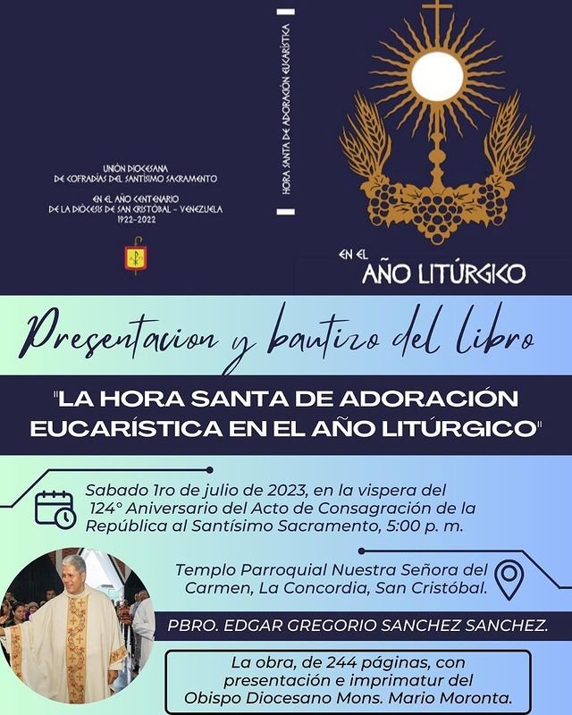 La Unión diocesana de Cofradías del Santísimo Sacramento del Altar invita a la presentación y bautizo del libro “ la hora santa de adoración Eucarística en el año litúrgico” del autor Pbro. Edgar Gregorio Sánchez, Asesor Diocesano de la Unión de Cofradias del Santísimo Sacramento.