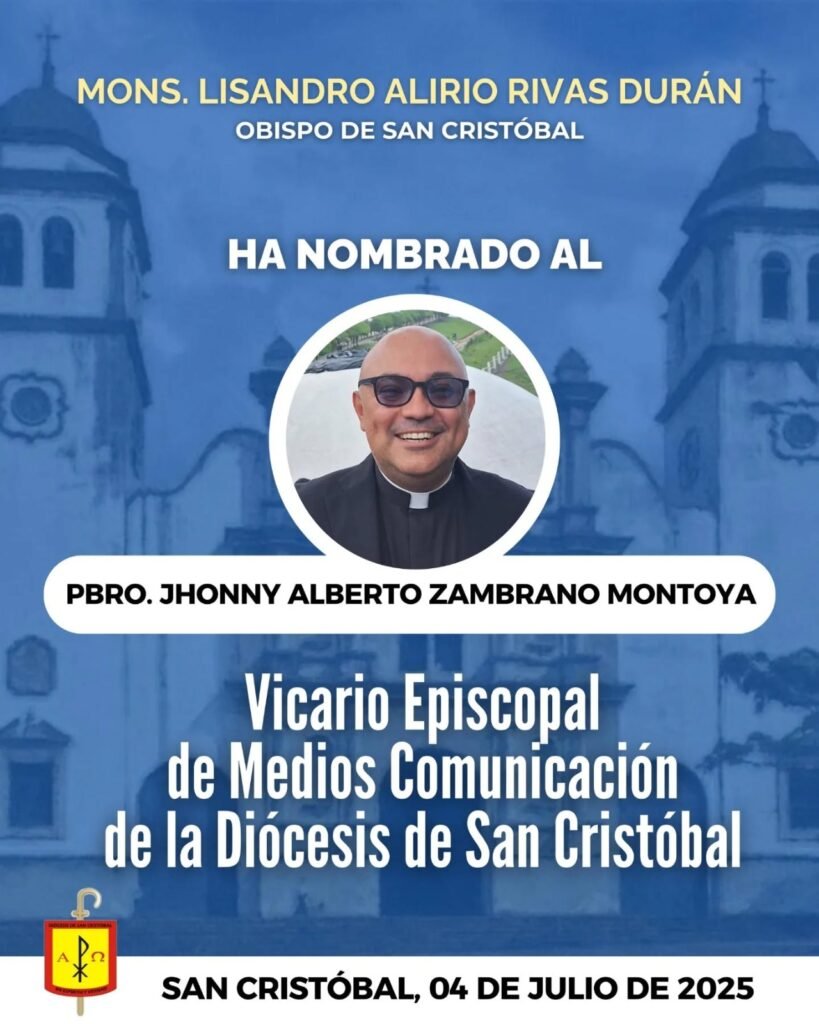 Monseñor Lisandro Alirio Rivas Durán, obispo de San Cristóbal, en comunión con el obispo auxiliar, Mons. Juan Alberto Ayala Ramírez y el presbiterio, ha nombrado al Pbro. Jhonny Alberto Zambrano Montoya, vicario episcopal de medios de comunicación de la Diócesis de San Cristóbal.