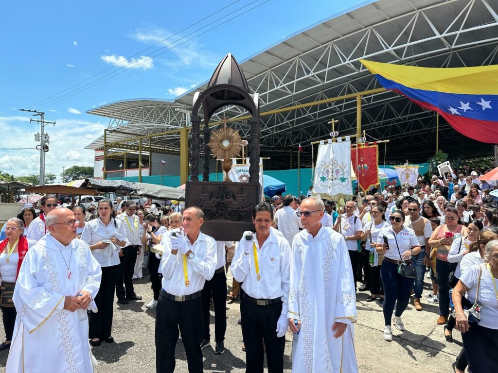 Al término de la Santa Misa, se llevó a cabo la solemne procesión con el Santísimo Sacramento del Altar por la vía panamericana, recorriendo la calle 2 de La Fría hasta llegar a la tarima central. Allí se realizó el acto de consagración y la bendición sobre todos los asistentes, elevando plegarias a Dios por la paz en Venezuela.