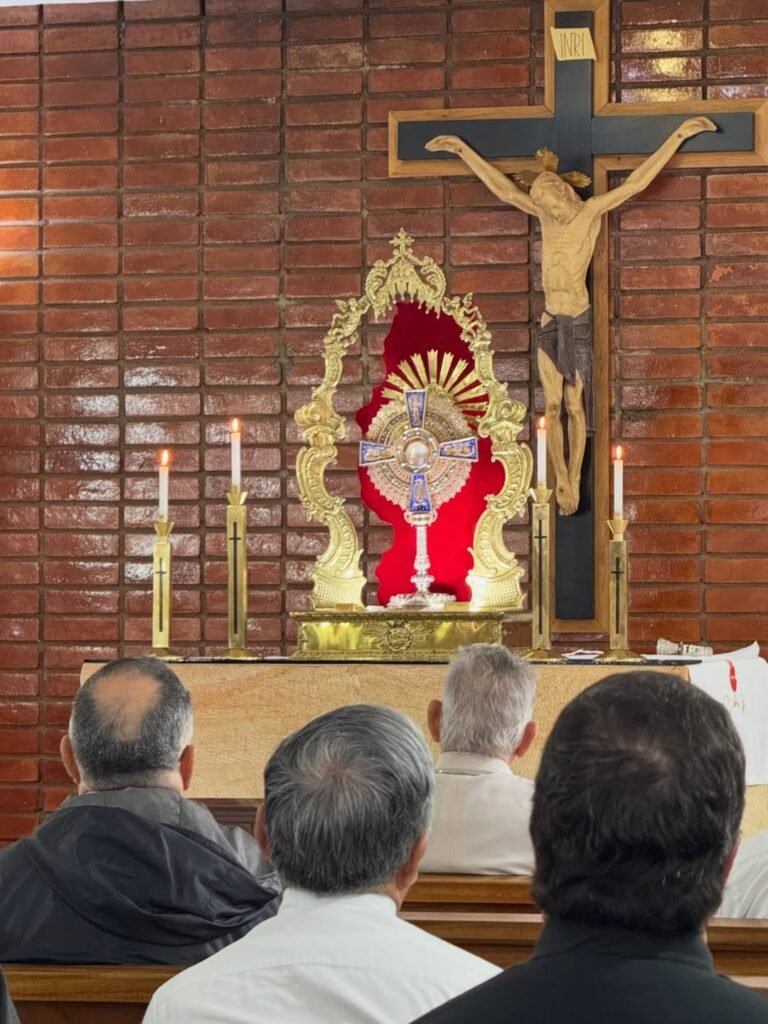 La jornada inició a los pies de Jesús Sacramentado con la Adoración al Santísimo, animada por el Seminario Franciscano, un espacio propicio para la confesión y el diálogo fraterno entre nuestros sacerdotes.